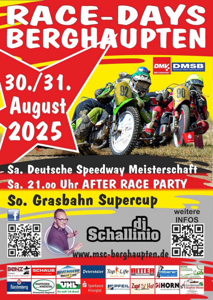 Unsere Race Days sind das Motorsport Event im Ortenaukreis. Am Samstag wird auf der 262 Meter langen Speedwaybahn gefahren. Das Training und die Vorläufe des Rahmenprogramms beginnen bereits Mittags, bevor das Hauptrennen am Abend unter Flutlicht startet.